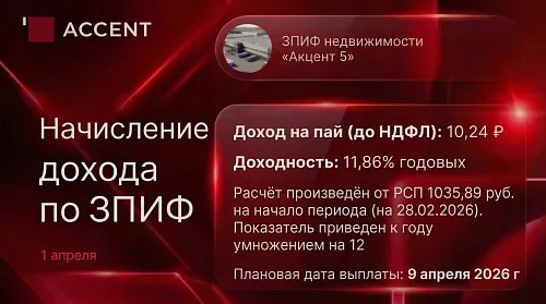 1 апреля мы произвели начисление дохода по паям ЗПИФ недвижимости «Акцент 5» за март 2026 года